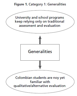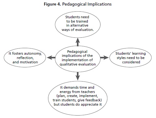 After the analysis of the information collected through the different gathering techniques used, three salient aspects emerged. These categories are directly connected to the research variables that were identified at the beginning of this study: Qualitative evaluation, quantitative evaluation, and the students’ reflections on alternative assessment.