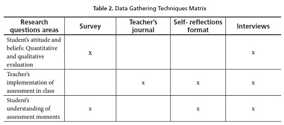 The validity and reliability of the study are assured by the synergy among the different data gathering techniques. They account for both the participants and the teacher-researcher’s views, and were also designed in such a way that one technique is backed up by another when considering the different variables or constructs of the study, as shown in the Data Gathering Techniques Matrix (Table 2). This provides this study with reliability. In addition, validity is also present because the techniques that were selected and designed tackled the concerns that arose from the questions and variables of the study.