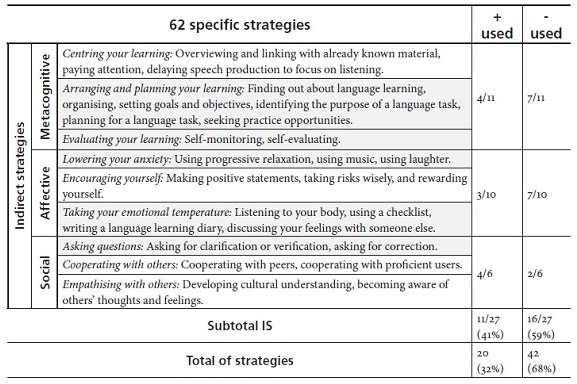 Table 3 shows that 68% of the 62 specific strategies were not used by the students. It is understandable that these freshmen were not familiar with many strategies that would benefit their overall learning. However, an adequate number (32%) between DS and IS were found as the most used, meaning that they were possibly taught before or used naturistically by these students based on their learning styles and purposes. The students used more IS than DS. This suggests a certain level of awareness and reflection on their learning process. Within the metacognitive group (IS), centring your learning was the most used strategy, revealing that the students made connections between prior and new information, paid attention to their process, and focused on listening. Songs comprised the learning resources most used by the students, as reported in the focus group and surveys. Songs were used to practice pronunciation and increase vocabulary and linguistic structures. It is usual that beginners centre their learning on songs and on the listening skill, diverting their attention from other academic resources and language skills that may enrich their linguistic knowledge.