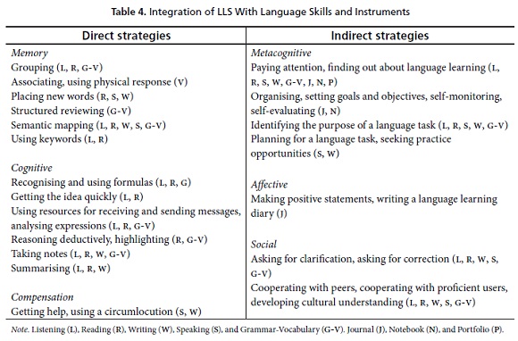LLS have originated several taxonomies (O’Malley & Chamot, 1990; Oxford, 1990, 2013; Wenden & Rubin, 1987). The differences are determined by the selected number of strategies, sub classifications, and distinct research methods used to group them more comprehensibly and accurately. Although a broad number of LLS have been proposed, language learners choose the strategies that fit their age, gender, cultural background, personality, proficiency, language learning needs and interests, and learning styles (Chamot, 2009; Cohen, 2014; Oxford, 2013). We adopted Oxford’s (1990) LLS taxonomy since it has been widely used in LLS research, making this classification valid and reliable. The model offers a detailed classification of direct and indirect strategies that can be intertwined with language tasks. Oxford’s set of strategies leads to specific outcomes. Although the author proposes a new LLS classification in her updated strategic self-regulated (S2R) language learning model (Oxford, 2013), she still suggests that learning strategies are teachable and that learners select the ones that address their learning purposes. Further research might explore this new taxonomy.