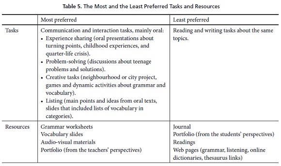 It is evident that the students preferred oral tasks to literacy tasks. This preference might be related to the students’ desire of getting input through conversations and interviews and to practising the language. The preferred listening tasks and audio-visual materials engaged the students in identifying general and specific information, summarising, classifying, and reporting descriptions, interviews, narratives, and documentaries. The images and videos supported the students’ listening comprehension. As to speaking, class discussion on different topics, presentations, and projects helped them improve their fluency, pronunciation, and self-confidence.