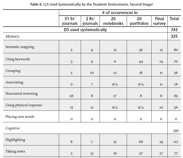 Sixty-six percent of the students stated that they transferred the strategies to other subjects (French, Spanish composition, English pronunciation, and morphology classes); this was corroborated in eight notebooks and six portfolios in which the students attached evidence voluntarily. Table6 summarises the findings of all instruments of the second stage. The shaded boxes indicate the LLS used systematically by the students.