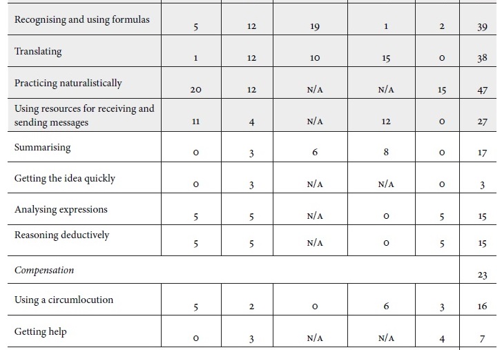 The most used DS, cognitive strategies (practising, receiving and sending messages, and creating structure for input and output) provide learners with opportunities to develop receptive and productive skills. Since memory and compensation strategies were the least used, it might explain the students’ anxiety and low confidence level. These strategies facilitate the students’ recall and organisation of information easily, enrich their vocabulary, and help them overcome limitations when speaking. All in all, the fact that these students did not use all the LLS at all times does not necessarily mean that they were not good learners (Rubin & Thompson, 1994) or that their learning was not effective (Chamot, 2009; Oxford, 2013); nevertheless, if they had implemented more specific and systematic strategies, their academic process could have been more effective.