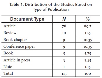 As can be seen in Table 1, 89.7% of the studies are articles, and 11.5% of them are published as articles. Therefore, it can be said that researchers prefer publishing research articles more than reviews.