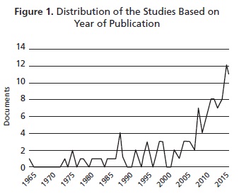 As can be understood from Figure 1, most of the studies were carried out in 2015. In addition, it can be seen that the number of articles in 2016 is higher than the number of articles in 2011, 2012, and 2014. Results revealed that gifted education is not handled and examined in the studies, especially between the years of 1966 and 1973. On the other hand, trends in gifted education were increased after 2000. The number of studies in 2013 and 2016 was dramatically increased, improved, and became more prevalent. However, a decrease was observed in 2009 in terms of number of publications on language and gifted education when compared to 2005.