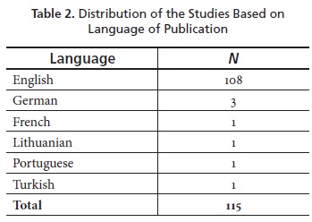 As can be seen in Table 2, 108 articles were written in English, and three of them in German. Results indicated that researchers tend to produce publications in English. It is also seen that a few researchers published their articles in German.