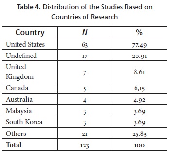 Since some of the 115 articles were written by two or more authors, the total number of authors was found to be 123. As can be seen in Table 4, 77.49% of the studies were conducted in the United States; 8.61% of the articles were conducted in the United Kingdom; 6.15% in Canada; 4.92% in Australia; 3.69% in Malaysia and South Korea. In addition, 20.91% of the studies were shown as undefined since the countries were not mentioned. Results revealed that most of the studies on language and gifted education were carried out in the United States.