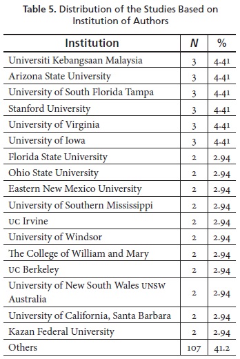 Some authors exhibit more than one affiliation. As can be seen in Table 5, 4.41% of the authors were from these institutions: Universiti Kebangsaan, Malaysia, Arizona State University, University of South Florida, Tampa, Stanford University, University of Virginia, University of Iowa; 2.94% in Florida State University, Ohio State University, Eastern New Mexico University, University of Southern Mississippi, UC Irvine, University of Windsor, The College of William and Mary, UC Berkeley, University of New South Wales UNSW Australia, University of California, Santa Barbara and Kazan Federal University.