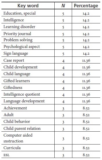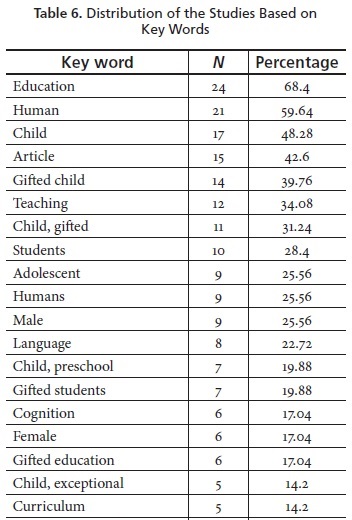 As can be seen in Table 6, 68.4% of the key words were education; 59.64% were human; 48,28% were child; 42.6% were article; 39,76% were gifted child; 28.4% were students; 25.56% were adolescent, human, male; 22,72% were language; 19.88% were child, preschool, gifted students; 17.04% were cognition, female, and gifted education; 14.2% were child, exceptional, curriculum, education, special, intelligence, learning disorder, priority journal, problem solving, psychological aspect, sign language; 11.36% were case report, child development, child language, gifted learners, giftedness, intelligence quotient, language development; 8.52% were achievement, adult, child behavior, child parent relation, computer aided instruction, curricula, and ESL.