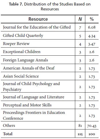 As can be seen in Table 7, 6.08% of the articles were published in Journal for the Education of the Gifted; 4.34% were published in Gifted Child Quarterly; 3.47% in Roeper Review; 2.6% in Exceptional Children and Foreign Language Annals; 1.73% in American Annals of the Deaf, Asian Social Science, Journal of Child Psychology and Psychiatry, Journal of Language and Literature, Perceptual and Motor Skills, Proceedings Frontiers in Education Conference and 70.43% of them were defined as the others.