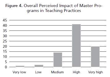 For most participants their enrollment in master degree programs impacted positively their development as teachers. In all of the four pre-established categories discussed, three recurrent topics can help to summarize findings. To begin with, participants perceived that their graduate education made them more reflective, which allowed them to deepen their analysis of educational policies and to carry out curricular adjustments. Regarding research, reflection seemed to be of paramount importance in order for participants not only to configure and conduct informed and coherent inquiry and pedagogical activities, but also to understand the relevance of research itself. Innovation at various levels of their teaching-related endeavors emerged as a second topic intersecting the categories of perceived impact in association with respondents’ master studies. For master degree graduates and candidates, inasmuch as their education favored their reflection and research abilities, they were more prompt in transforming their pedagogical practices. Likewise, some participants felt empowered to examine and possibly adjust or change institutional educational policies.