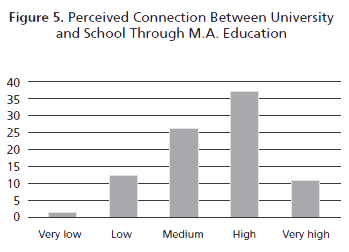 Similarly, Figure 5 shows that 61% of participants regarded their master’s program studies as facilitators of connections between schools and universities at a high or very high degree, and 32% at a medium degree. The previous findings contradict González’ (2003) and González et al.’s (2002) studies in which their participants did not acknowledge master studies as substantial avenues to support them in connecting what they learnt in such programs with their classroom practices. An explanation for the contrast between findings in the two studies might be that M.A. programs have evolved from the time González et al.’s and González’ studies were conducted and currently, these courses’ methodology, curriculum, focus, and approaches are more geared towards participants’ needs which lead to a greater impact of their education on their contexts.