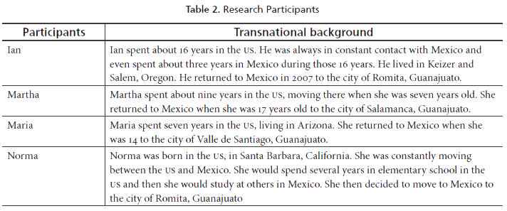 The participants of this study were all students in a BA in TESOL program at Universidad de Guanajuato (Guanajuato campus) and also in-service teachers at different institutions in the state of Guanajuato. Participants were within the 19-25 age group and three females and one male were selected. However, the determining factor for their selection was their transnational background. Table 2 presents each participant along with such background.