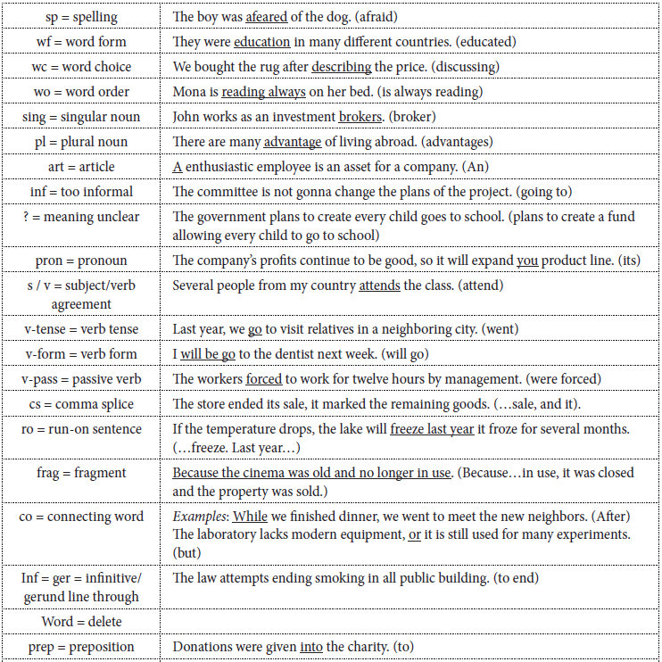 Using error codes is practical and beneficial since it helps teachers and learners to approach text revision as a problem-solving task; they provide learners not only with clear parameters about what to revise but also with a common set of symbols which standardizes the text reviews as long as the code is clear and has been explained to the users. Buckingham and Aktuğ-Ekinci (2017) consider that the correction codes also help teachers to provide individualized feedback in subsequent drafts in a timely manner without putting an extra workload on themselves. Actually, the code symbols prevent the use of many words to provide feedback and allow a more efficient use of time. In addition, if error codes are used during self and peer correction, during the teaching of writing as a process, learners may become more reflective about and autonomous in their writing.