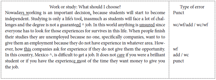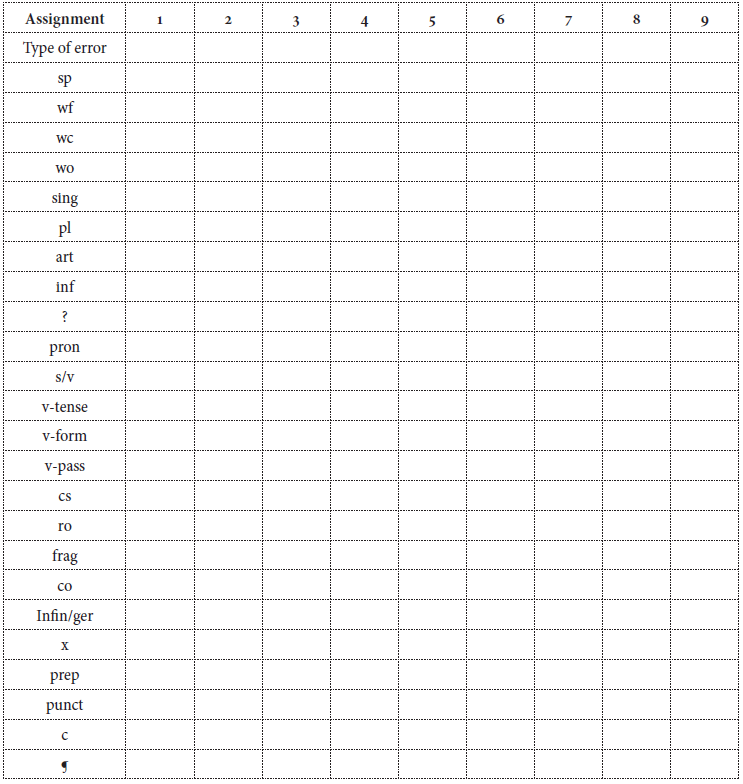 The participants were nine students, seven females and two males whose ages ranged from 20 to 22 years old. They were in the sixth semester of the B.A. in language teaching at UATx. In order to learn about the participants’ writing habits, a short survey was applied to the learners; it helped to set the students’ writing practices. Furthermore, the data were collected through two written assignments based on the tasks of the course book and which were revised using an error code and implementing peer correction so two versions of each assignment were submitted (rough and final drafts). In addition, students were asked to register their errors in an error log in order to monitor the type and amount of errors made. At the beginning of the semester the teacher explained how to use the error code and that the writing skill was going to be developed in a systematic way. That is, carrying out the five stages of the writing process. The first assignment was to write a paragraph about their college life-style, the second text produced was an invitation letter to spend the summer with a close friend, the third was a fiction story, and the last one was to express their thoughts about students who work. The second text ranged from 100 to 150 words while the last one ranged from 350 to 400 words.