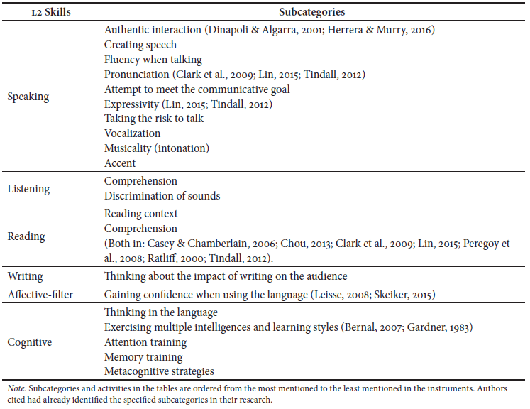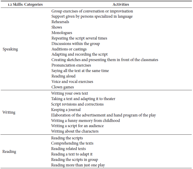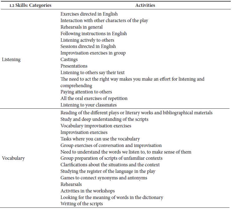 Table3reports the specific exercises or activities that participants remembered helped them improve in the different aspects of L2 learning. Improvisation exercises were mentioned as enhancers of most L2 skill categories (Hodgson & Richards, 1966; Kurtz, 2011; Perone, 2011; Spolin, 1963).