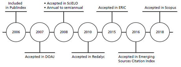 Eventually, the Profile journal’s somewhat localized focus grew, and we began to accept manuscripts from other teacher-researchers in and outside Colombia. Accordingly, the journal started to observe international standards for scientific publications and to take advantage of the technological tools available to reach a wider audience and accept a higher number of contributions. Thus, in 2008 the frequency of publication went from annual to semiannual and the electronic version of the journal was launched, making the adherence to the open access movement possible. At the same time, the journal was being submitted to and accepted by the most important databases and bibliographical indexes, something that attested the growing quality of the journal (the latest achievement in this regard was the inclusion in the Scopus database in 2018 [see Figure 1]).