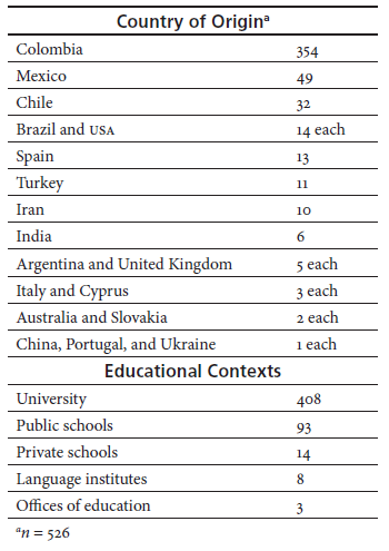 We have gathered twelve articles in this edition; five of them are authored by Colombian scholars, three are from Chilean researchers, two are from the Mexican context, one from Portugal and one from Spain. The first section, Issues from Teacher Researchers, includes seven articles; six concerning teacher education with two populations in mind: pre- and in-service teachers, and one related to EFL university students. In the second section, Issues from Novice Teacher Researchers, we include a paper by two researchers, a novice and an expert in an exploration about teaching contexts. The last section, Issues Based on Reflections and Innovations, contains four articles that discuss teacher education in specific contexts and areas of knowledge.