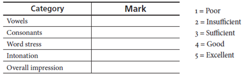Evaluation sheet. An evaluation sheet (Appendix A) was included to collect the data from each teacher. This sheet did not include descriptors so that the teachers could freely jot down their own perceptions rather than refer to pre-defined specific ratings. However, specific categories in the area of pronunciation were included. Segmental features, which involve sounds-namely vowels and consonants-and suprasegmental features-which are present across and beyond segments-including word stress and intonation. Extra variables, such as rhythm or sentence stress, were not included because they require the expertise of highly specialized teachers with an ample knowledge of phonetics, which was not a requirement for the participants in this study.