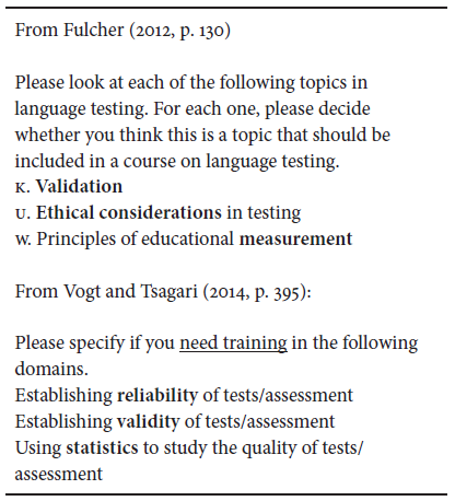 One last internal limitation that I see in the use of questionnaires to tap into language teachers’ LAL is the use of technical jargon. To illustrate, validity in language testing and in other fields (e.g., psychology) traditionally has represented the degree to which an assessment instrument measures what it is supposed to measure and nothing else (H. D. Brown & Abeywickrama, 2010). However, it can be ascertained with confidence that this is no longer an accurate definition in language testing, which has embraced Messick’s (1989) view on the matter. So, in a survey where language teachers select validity as a concept (in fact quite a far-reaching and ongoing debate) to learn about in language assessment, some may not be aware of what the term actually implies. In other words, how can I know that something is important (or that I need training in it) if I am not sure what that something really is? Or perhaps my definition may be inappropriate or incomplete. Table 2 includes sample items from two different questionnaires for researching the LAL of language teachers. The items refer to long-standing debates in language testing and require, to my belief, a good deal of knowledge to understand them. I have highlighted them in bold and made minor modifications to the format of the original questionnaires.