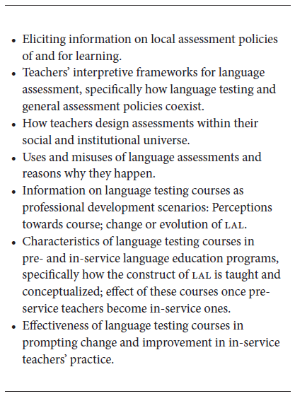 In order to further comprehend these two aspects of the LAL construct (practices and beliefs), qualitative research should be conducted on the relationship between language assessment and policies for general assessment. For instance, in Colombia, it might be enlightening to know how language teachers in schools use the decree 1290 for their particular assessment practices and what they think about it. In a related manner, research can ask teachers about how they design an assessment in its general universe. To illustrate, an assessment can align with a school curriculum and modality (e.g., tourism), students’ ages and interests, a school’s general philosophy of language learning (e.g., communicative), standards for language learning, and can follow national guidelines (e.g., be mostly formative, as decree 1290 suggests). In other words, research can be conducted on what institutional and social forces shape language teachers’ design of assessment instruments and whether or not there is harmony or tension in this relationship.