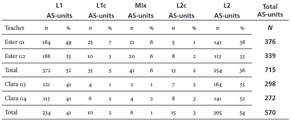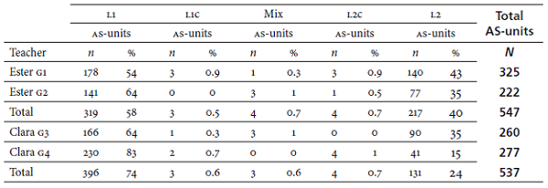 To sum up, the overall number of L1-only units in the two classroom modes (56%) represents a substantial amount of L1 produced by these two teachers. L1 was the most used language by Ester (691 out of 1,262 units, with 55%) and Clara (630 out of 1,107 units, with 57%). These numbers show that even when there were differences between the two teachers across modes, both produced a very similar number of L1-only units. Across teachers and modes, the most frequently used language by these teachers was L1-only (56%), followed by L2-only (39%), Mix (2.3%), L1c (2.2%), and L2c (0.5%).