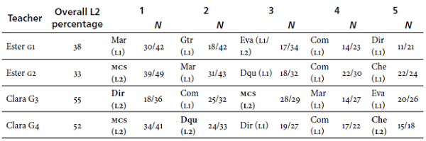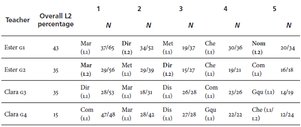 Due to space constraints, analysis of the functions performed by these two teachers are presented in terms of the five most frequent teaching acts performed in their classrooms, as well as their dominant type (L1 or L2) in the managerial and materials mode. Table 4 presents this information for the managerial mode. Regarding Ester’s data, the most frequent function in her two classes was marker, and her most dominant language was L1 in one group and L2 in the other. However, the number of instances in which the function is performed in both groups (37 out of 65 for the L1-dominant group and 29 out of 56 for the L2-dominant group) suggests a similar number of code-switching instances. In contrast, Clara’s data show that the most common function was not the same in her two classes: the most common functions for Groups 3 and 4 were directive and comment, respectively, and were mostly performed in the L1. Ester produced three of her most common functions with L2 as a dominant language (marker, directive, nominate), with nominate reaching the highest percentage of L2 dominance (65%). Thus, she used the L2 profusely when disciplining students and giving instructions (some of which were reinforced by an L1 translation). Clara did not have L2 as a dominant language in the most frequent functions performed by her.