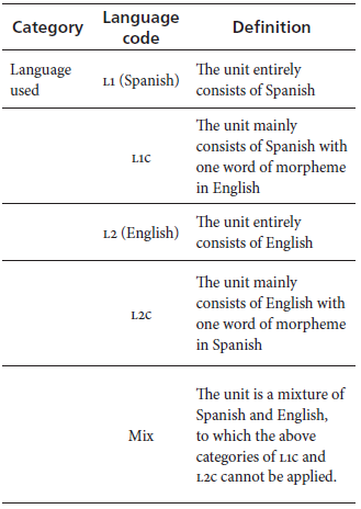 The AS-unit is more suitable for this type of analysis than other types of units such as the T-unit and the C-unit, because it was created especially for analysing oral discourse and, therefore, it can account not only for sentences and phrases but also for utterances even when they seem to be fragmentary on the surface. There are a number of rules for the segmentation of the data into AS-units. For example, the independent clause in the AS-unit must minimally include a finite verb. There are also rules for considering minor utterances (e.g., “yes” and “now”) as AS-units, as long as they perform a full function. Space constraints prevent the researchers from including the set of rules, which may be found in Foster et al. (2000). Once the AS-units were identified, a language code for each was determined. This was done by following a set of guidelines adapted from Kim (2001), and included procedures for treating proper nouns, interjections, and word fragments, as well as rules for classifying the AS-unit as one of the five language codes existing in the FLAATT instrument.