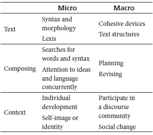Table 1 shows the two perspectives of writing (micro and macro) as well as three dimensions with respect to which writing has been investigated: the text, the composing, and the context. Thus, one could examine a piece of writing at the micro level while focusing on the context. For example, exploring linguistic marks that account for the voice of the writer. On the other hand, at the same level from a macro perspective, it would correspond to study the way in which the writer shows allegiance to a particular discourse community.