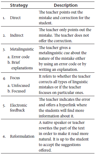 Abstract: Although several investigations have been carried out in recent years on written corrective feedback (WCF), there is a lack of agreement about its definition and the effect on students’ writings of different types of feedback. This may be due to the lack of systematicity regarding the characterization of WCF used in those studies. This article seeks to review the concept of WCF in studies in the field and to systematize the various aspects considered in a typology, which includes specification, focus, scope, source, mode of delivery, and notes. The resulting typology should help improve the effectiveness in the comparison of WCF studies and serve as a reference for teachers interested in expanding their practices.