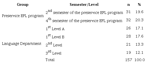 For this study, in the preservice EFL program, the second and fourth of ninth class levels participated in the study, these courses had 31 and 32 students respectively (n = 63). On the other hand, 94 students from the Language Department program participated: two first-level groups, with 26 and 28 students respectively, one second-level group with 21 students, and one third-level group with 19 students (see Table 1).