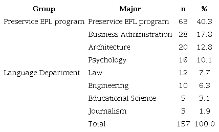 The group of students in the Language Department comprised various majors at the University. In this group, 17.8% of the students were studying Business Administration, 12.8% were studying Architecture, 10.1% were studying Psychology. The rest of the students were students of Law, Engineering, Educational Sciences, and Journalism (see Table 2).