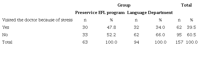 During the last semester a higher number of students in the preservice EFL program (47.8%) mentioned visiting the doctor because of stress than did the Language Department students (34%). On average, 39.5% of students reported having visited the doctor due to stress in the previous six months (see Table 3).