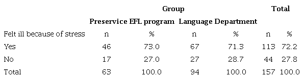 There is no great difference between one group and the other; 73% of the students in the preservice EFL program felt ill because of stress, and 71.3% in the Language Department also felt ill for the same reason. On average, the majority (72.2%) stated that they had felt ill because of stress in the previous six months, an alarming situation since it means that a high percentage of English language students at the Universidad de Cuenca feel stressed, but have not necessarily visited the doctor (see Table 4).