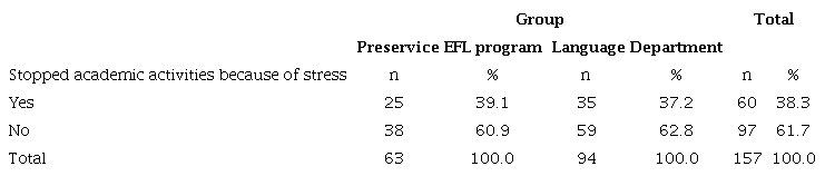 There is no major statistical difference separating students who stopped their academic activities because of stress in one group or the other. The percentage of preservice EFL program students who stopped their activities is 39.1% and in the Language Department 37.2%. Thus, on average, nearly four out of ten (38.3%) students from both groups said they had stopped their academic activities (skipping classes or not doing homework) because of stress in the previous six months (see Table 5).