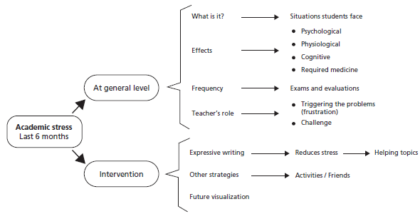 It is important to mention that for the qualitative analysis, as the results in the quantitative phase of the study did not show a significant difference between the two studied groups, it was unnecessary to have separated results for each group. In this respect, academic stress was conceptualized from two fundamental angles: The first looks at students’ general conceptions of academic stress, that is, looking at its effects, its frequency, and the teacher’s role. The second angle corresponds to the ideas expressed about the practice of expressive writing over the most recent six months. Figure 1 shows the code and code-family interweaving.