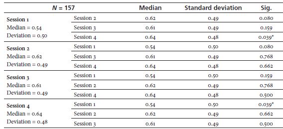 The students’ perceptions, in both groups, were measured in four instances right after they used the expressive writing strategy and were evaluated (Session 1, Session 2, Session 3, and Session 4). These do not show great variation in the three first instances of using expressive writing, since positive effects are in evidence in more than half of the students in a similar way (p ˃ 0.05). However, in the fourth session, some significant differences with respect to the first measurement are noted (p ˂ 0.05). This implies that the level of stress reduction is maintained in a similar way in each evaluation experience until the third intervention, and in the fourth intervention, a significant increase in the favorable effects of expressive writing is noted (see Table 6), a situation that needs to be highlighted.