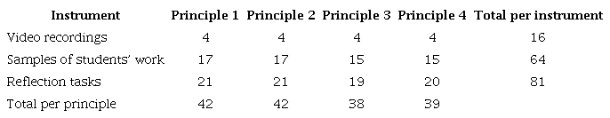 Data collection resources included video-recordings of all classes, samples of students’ work, and students’ written reflection tasks. To collect these data, consent forms were procured from both the program coordinator and the students, and pseudonyms were assigned to all participants. Samples of students’ work were collected at two different moments: (a) in the guiding stage and (b) in the practice stage of each cycle, which included text analyses done by students. Reflections took place at the reflection stage of each cycle and were carried out in Spanish so that students would feel more comfortable expressing themselves. In them, students reported what they had learned about the principle and if the strategies provided had helped them read more critically. Table 1 shows a summary of all data collected.