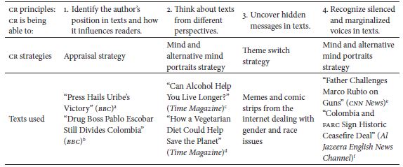 The pedagogical unit comprised 16 classes, taught in the course of four weeks. To organize the unit, McLaughlin and DeVoogd’s (2004) Strategy Instructional Framework was used in a cyclic manner (one cycle per CR principle) until all four CR principles were covered. Since students belonged to different fields of knowledge, we decided to use community instead of disciplinary texts. As for topics, we decided to include those that seemed appealing to a wide range of Colombians: Pablo Escobar, alcohol, use of guns, the ceasefire. We also used memes that displayed gender and race issues due to their currency in Colombian WhatsApp messages, and an article on vegetarianism, due to the explosion of vegetarian restaurants in the city. Table 2 shows both the strategies and the texts that were selected to teach each principle.