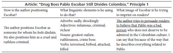 One of the three students who presented this challenge was Ana. In the activity referred to before, which intended to raise students’ awareness about the first principle-CR is about identifying the author’s position in texts and how it influences readers-and had students analyze Escobar’s news article during the guide stage, Ana showed that she was able to identify the linguistic elements that the author used to position Escobar as a drug lord and a violent person. However, she had problems recognizing that these elements positioned both the author and herself. When she was asked, “What image of Escobar is he trying to imprint on readers?” she answered,