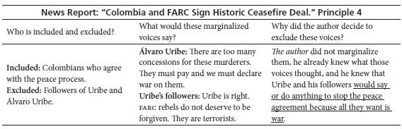 Table 6 shows how Juliana was not only able to identify marginalized voices in the news report (ex-President Uribe’s followers and the victims of the conflict) but to see the intentions behind the omission of those voices (“not to change the objective of the text” and “to keep his argument valid”).
