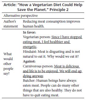 An example of these students was Pedro. During the guide stage for the second principle-thinking about texts from different perspectives-when students were asked to take a statement from Time Magazine about vegetarianism and try to take other perspectives, Pedro could only take perspectives that were either in favor or against the statement. Table 8 shows the perspectives that he provided and how he classified them.