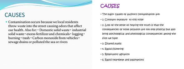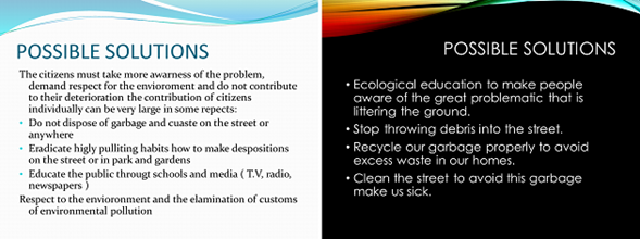 Next, we summarize the findings after analyzing the slides of five groups. It is worth mentioning that all the students demonstrated in this analysis the capacity to identify an environmental problem affecting their community. Some of the problematic situations found by students were: the excessive pollution of water and soils (Group1), street contamination (Group 2), bad odors and mosquitos due to accumulation of waste (Group 3), noise pollution (Group 4), and security problems (Group 5). The content of the five presentations was organized taking into account the main four aspects (problem, causes, effects, and solution) which students discussed.