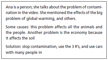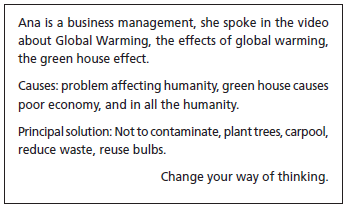 In a general view, students understood and conveyed messages, but it is evident that they should work on spelling, syntax, and cohesion, among other elements (see Figures 4 and 5 where there is a sample of students’ synthesis from the video).