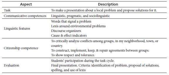 These competencies were developed thanks to the task-based methodology as learners were first exposed to situations that presented a problem affecting the people of the world. Afterward, they analyzed it, reflected upon it, and proposed possible solutions; later, as a task, students were asked to find a problematic situation affecting their community and then do some kind of research about the problem, the effects or consequences, and then propose possible solutions. This methodology promoted the planned citizenship goal since it prompted students to construct and celebrate agreements regarding what problem to discuss in their presentation, how to distribute the work and responsibilities among themselves, what text finally to present in their slides; to decide who would be those to present the work orally in front of the others. It is important to admit that students attempted to keep their agreement and sometimes failed, but what is more important to highlight is that they finally did what was required of them and made a presentation. The fact that students were able to look around in their communities with critical eyes and question what was perhaps taken for granted and accepted as an everyday reality constituted an important citizenship exercise.