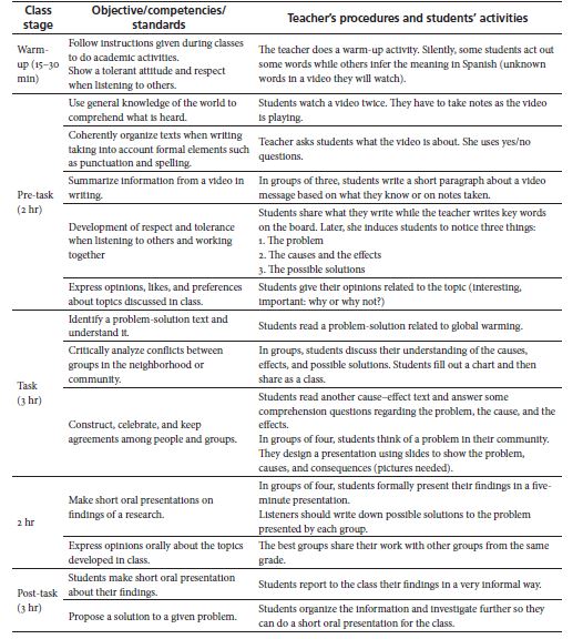A task-based unit was designed with the purpose of providing opportunities to expose learners to learn English and use it meaningfully, as well as to promote civic awareness about a global problem. The topic chosen by the researcher in consensus with the teacher-researcher was global warming. As a result, the unit proposed has some linguistic features, competencies, and evaluation and a general plan of action made up of details that are more specific about the lesson such as timeframe, objectives, procedures, and materials needed (see Appendices A and B).