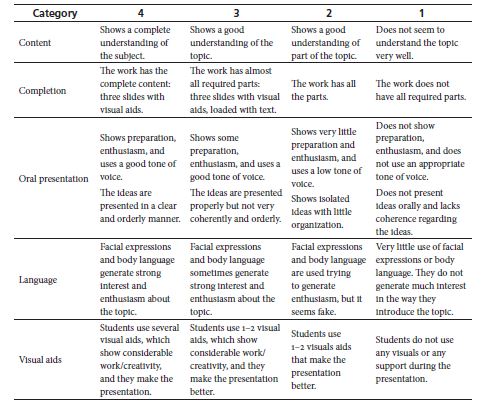 We designed a rubric to evaluate the presentations (see Appendix D). The criteria used for that evaluation were completeness, use of discourse markers and connectors, clarity and coherence, and citizenship competence.