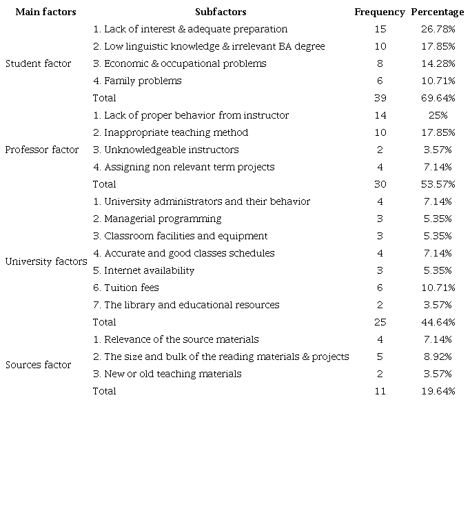 The first research question in this study was: “What are the possible factors which influence Iranian TEFL graduate university students’ academic failure?” The results of the interviews indicated that, generally, the Iranian TEFL graduate students considered four main factors affecting the academic failure of the students. As depicted in Table 1, the majority of the participants (n = 39, 69.64%) generally thought that the student factor (including four subfactors) was the most important one.