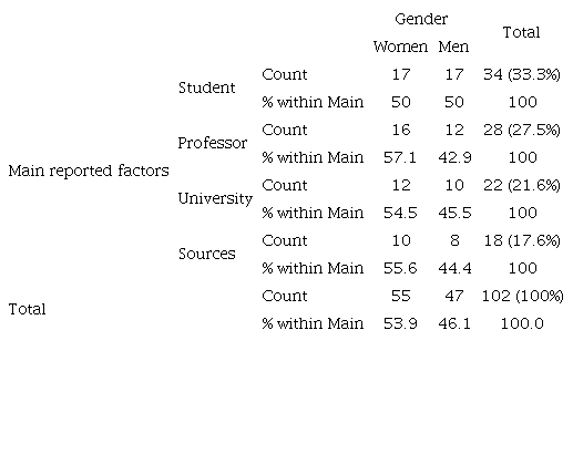 Table 2 shows the frequency of main factors in interviews across gender. As can be seen, the most important factors were the students (n = 34, 33.33%), the professor (n = 28, 27.5%), university (n = 22, 21.6%), and sources (n = 18, 17.6%). In addition, it needs to be pointed out that the results of the Chi-square test (X2 (3) = 3.50, p = .95) of independence showed that there was no statistically significant relationship between gender and academic failure.
