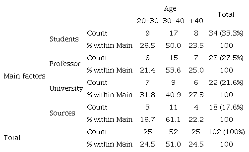 Table 3 shows the frequency of the main factors of academic failure mentioned by the participants in the interviews across different age groups (i.e., 20-30, 30-40, and above 40). Regarding student, the most frequently mentioned factor (n = 34, 33.3%), was found nine (26.5%) times in the 20-30 group, 17 (50%) times in the 30-40 group, and eight (23.5%) times in the above-40 group. Also, with regard to sources, the least frequently mentioned factor (n = 18, 17.6%), was found three (16.7%) times in the 20-30 group, 11 (61.1%) times in the 30-40 group and four (22.2%) times in the above-40 group. In addition, it needs to be pointed out that the results of the Chi-square test of independence (X2 (6) = 2.05, p = .91) indicated that there was no statistically significant relationship between the age of the participants and their academic failure.